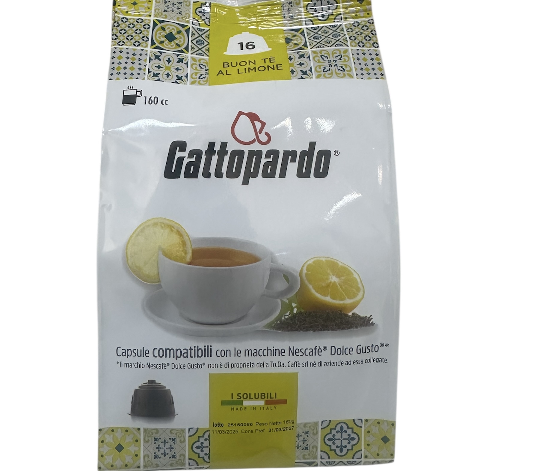 В упаковке по 16 капсул с разовой дозой растворимого лимонного чая Gattopardo, упакованного в защитную атмосферу.