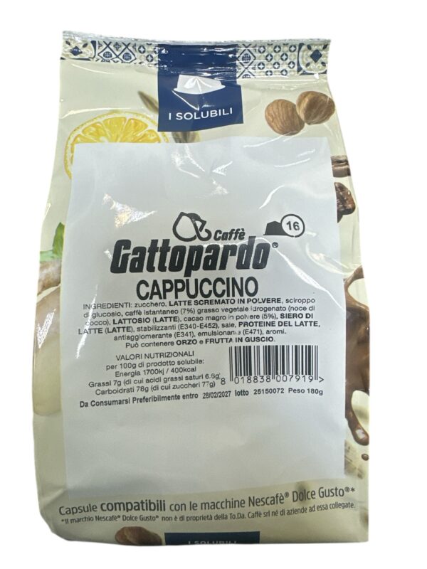 Pachetul conține 9 a câte 16 capsule de cappuccino Gattopardo.