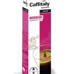 Capsule de cafea Caffitaly Morbido – este un excelent amestec moale de 70% mediu arabic de cafea prăjit și 30% robusta oferă o ușoară amărăciune băuturii. Retratarea și smântâna (spumă) fac posibilă distincția băuturii Morbido finite de alte soiuri de Caffitaly.